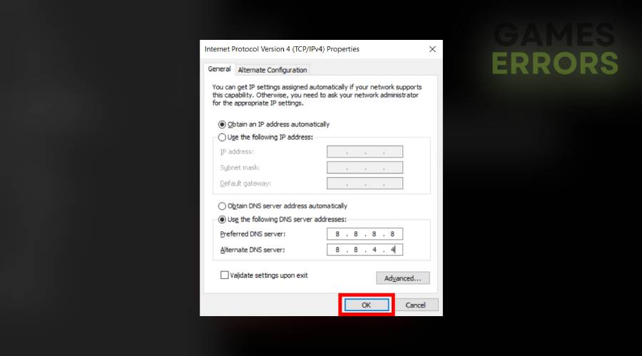 - 最後に、使用しますGoogleの8.8.8.8プライマリDNSサーバーとして8.8.4.4代替DNSサーバーとして。