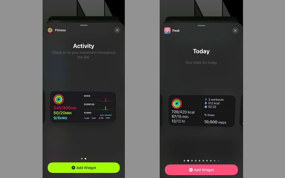 一方、そのライバルのサードパーティフィットネストラッカーアプリには、シンプルで使いやすいUIがあります。 iOS Health Appと統合されたPeak:Fitness Widgets Appは、ブロック内のさまざまなアクティビティメトリックを分解し、進行状況を簡単に見つけて表示できます。