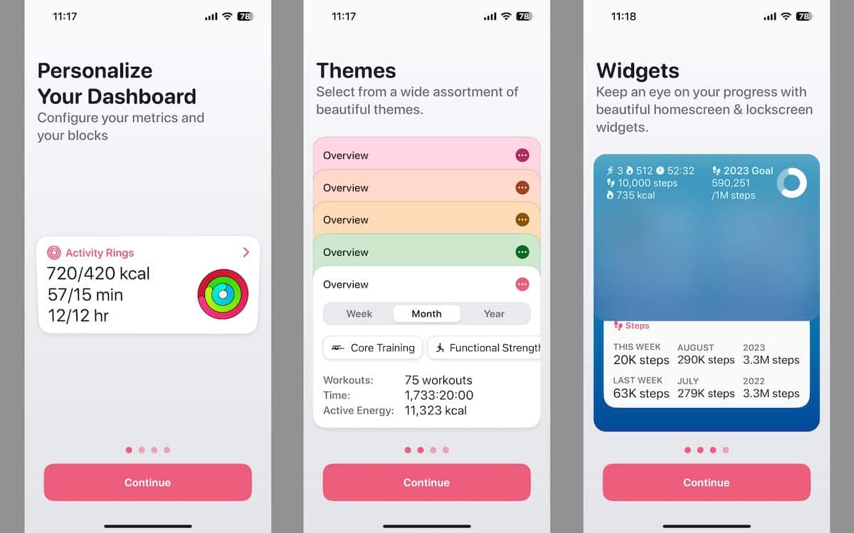 Fitness Trackerアプリを使用すると、ユーザーはPersonal Fitnessダッシュボードを作成して、好みのアクティビティデータを表示できます。また、ユーザーがアクティビティダッシュボードの外観をカスタマイズするための50を超えるテーマと、ロック画面とホーム画面用の多種多様な大小ウィジェットを、進行状況を一目で追跡することができます。