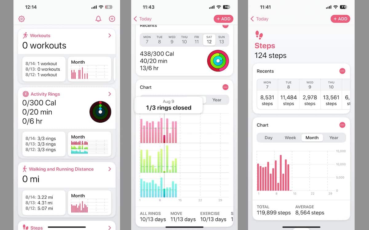 Apple Fitnessアプリは、ステップカウント、期間、目標、トレーニングなどのさまざまなメトリックも備えていますが、そのインターフェイスにはユーザーフレンドリーではなく、パーソナライズオプションがありません。