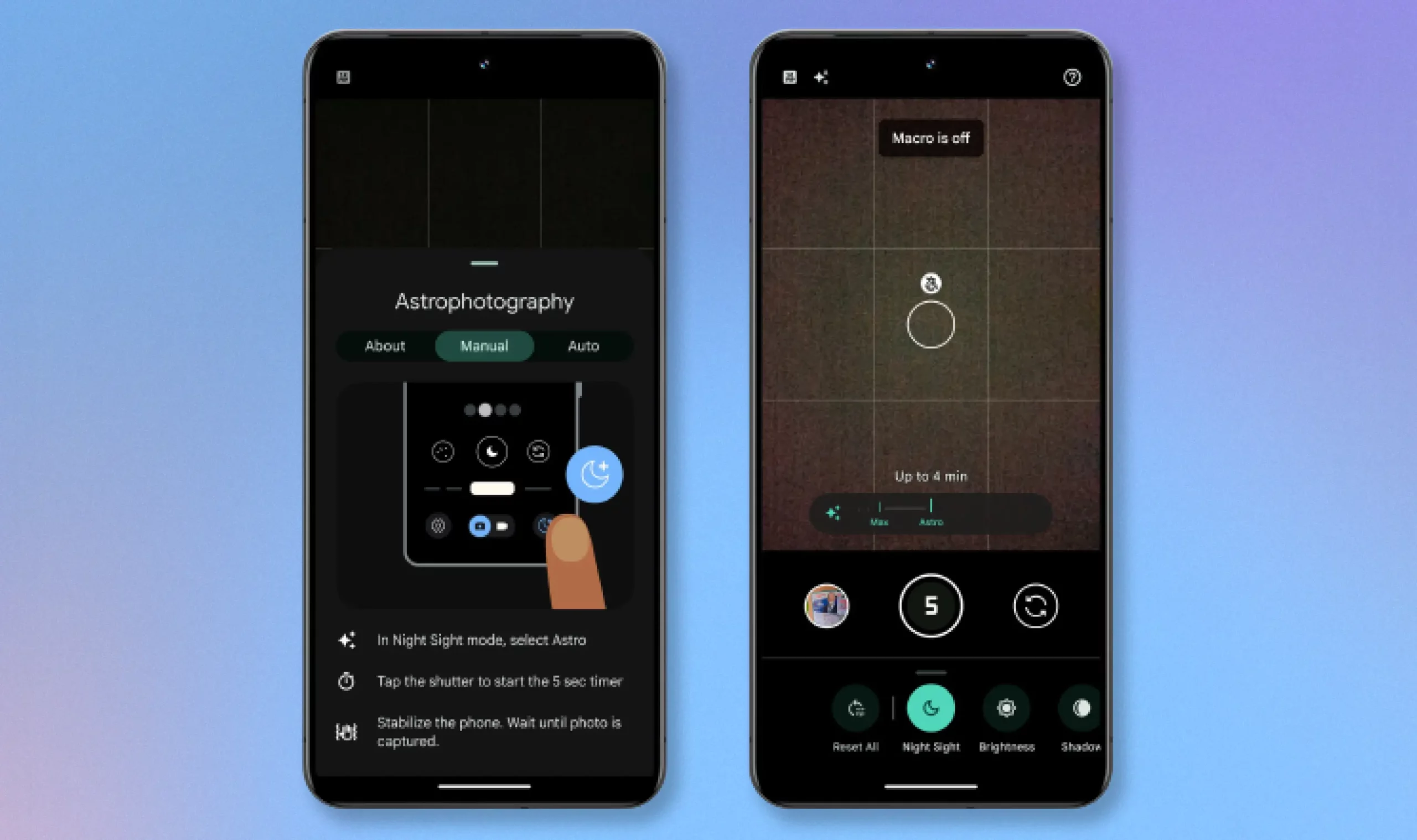 ピクセルユーザーは、シャッタータイマーやマニュアルアストロモードの露出時間枠などの設定を変更できます。デフォルトの5秒のシャッタータイマーは3秒または10秒に調整できますが、露出の時間枠は4分に達することがあります。より長い時間枠を選択すると、ピクセルカメラが複数の写真をキャプチャして1つにマージすることにより、高品質の天体写真を撮ることができます。