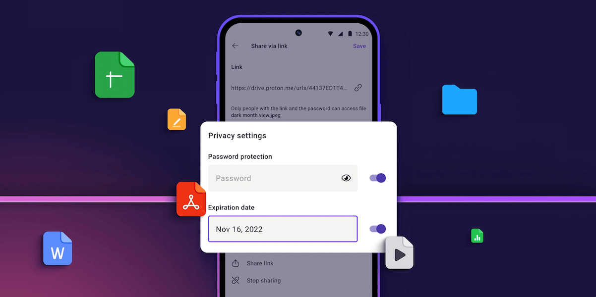 - パスワード保護を備えたプロトンアカウントを持っていない受信者とさえ、安全かつ安全にファイルを共有し、セキュリティのレイヤーを追加する日付を有効期限にリンクします。