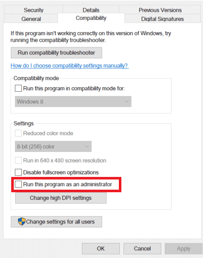 - チェックを外します「このプログラムを管理者として実行します」の下のオプション特権レベル。