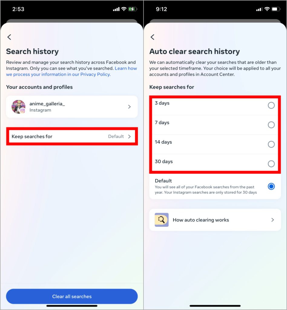 これを行うには、Instagramの設定に移動し、「セキュリティ」セクションにスクロールします。そこから、「検索履歴」を選択し、「自動クリア検索履歴」をタップします。次に、毎日、週、または月であろうと、検索履歴をクリアする頻度を選択できます。
