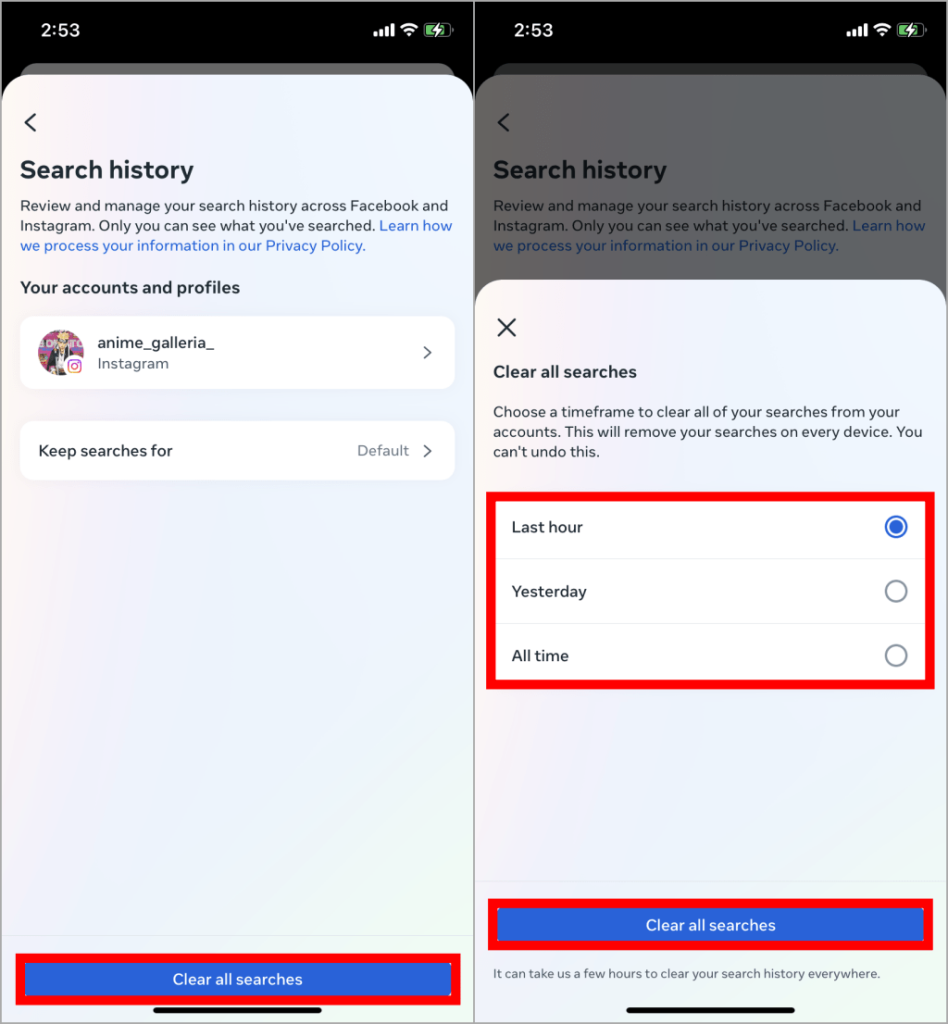 これを行うには、Instagramの設定に移動し、「プライバシー」セクションにスクロールします。そこから、「検索履歴」をタップして、「検索履歴をクリアする」を選択します。 Instagramは、検索履歴をクリアするための時間枠を選択するオプションを提供します。最後の1時間であろうと、昨日の歴史全体です。