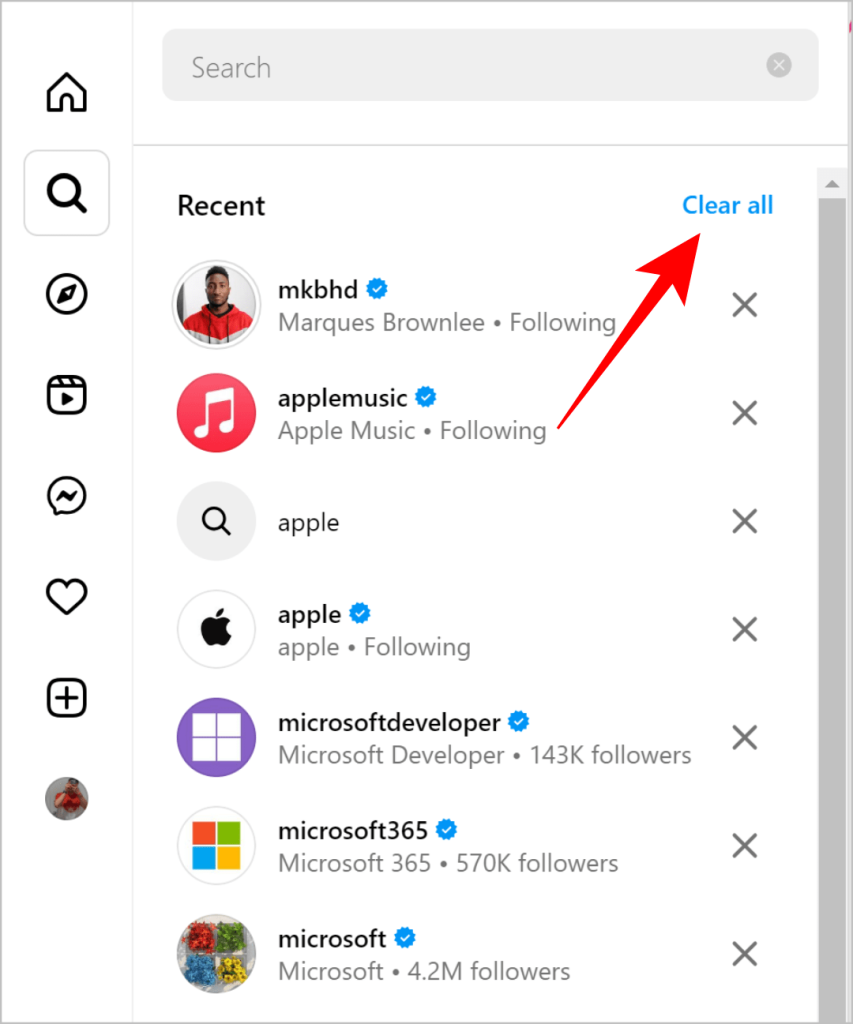 特定の検索を削除するには、Instagramの検索バーに移動し、拡大ガラスアイコンをクリックしてください。これにより、最近の検索が表示されます。そこから、各検索の横にある「x」をクリックして、削除する検索を選択できます。