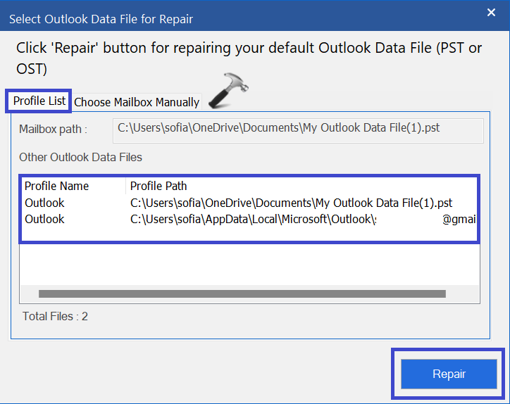 「手動で選択します」オプションを使用すると、コンピューターを手動で閲覧して、修理するPSTファイルを見つけて選択できます。