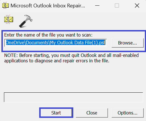 「」をクリックしますブラウズ」ボタンと修理するPSTファイルの場所に移動します。