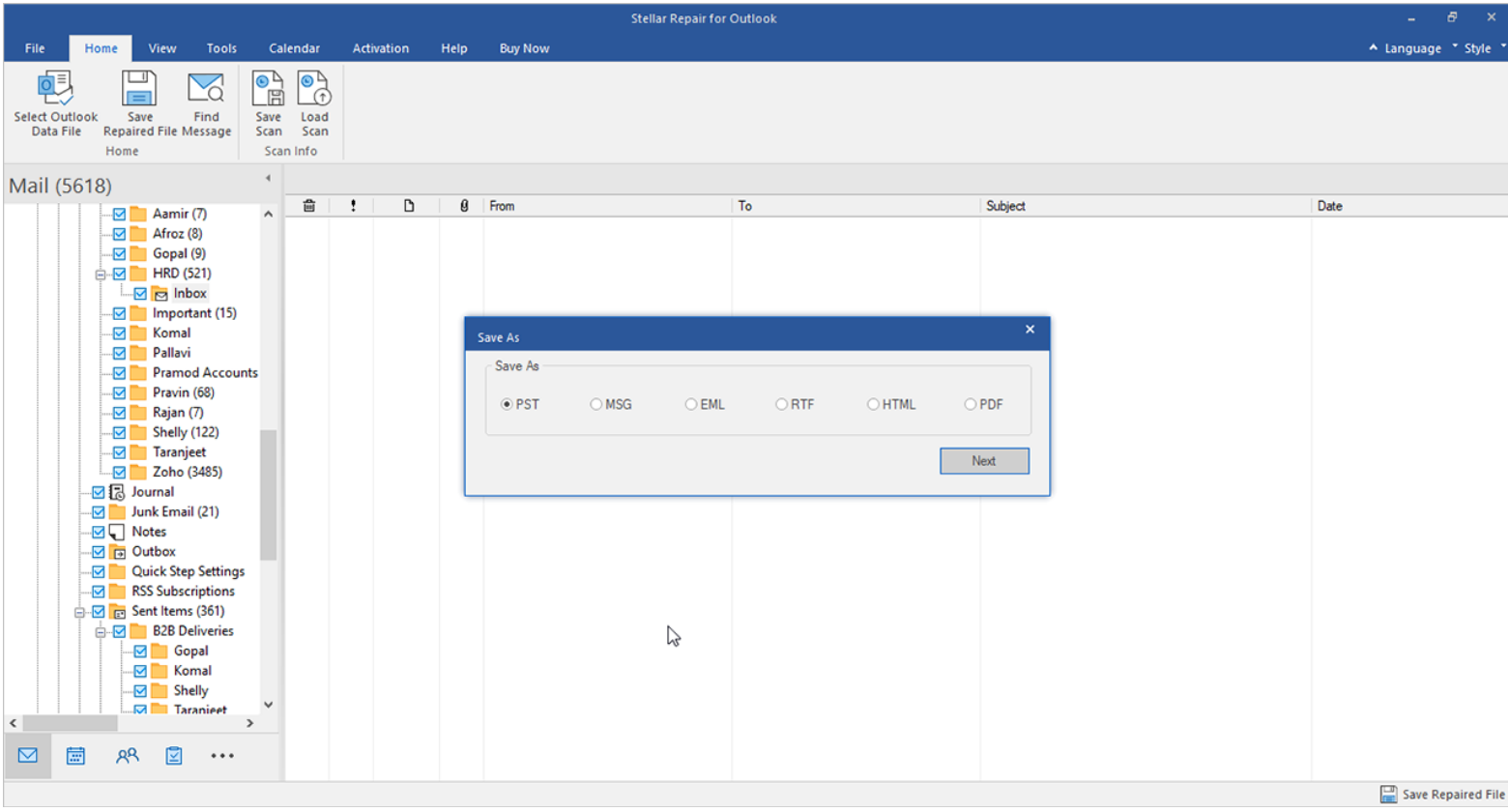 9. Outlookの恒星修理は、PST、MSG、EML、RTF、HTML、PDFなどの複数の保存オプションを提供します。PSTファイルを保存するオプションを選択します。