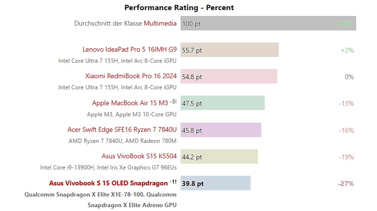 それは紙で印象的に聞こえます、そして、実際のテストは同じことを示唆しているようです。 Asus Vivobook S 15をテストしたレビュー担当者は、このデバイスは日々のタスクに非常に優れたパフォーマンスと印象的なバッテリー寿命を持っていると言います。 SOCは、Intel Lunar LakeとAMD Strix Pointに良い競争を与える可能性があります。しかし、QualcommのSnapdragon xチップセットは、レビュー担当者がラップトップで演奏したさまざまなゲームのベンチマークによると、ゲームテストではあまり不十分であったようです。ノートブックチェックチップセットを他のアームチップと比較し、Snapdragon Xはテストで最も低くランク付けされました。