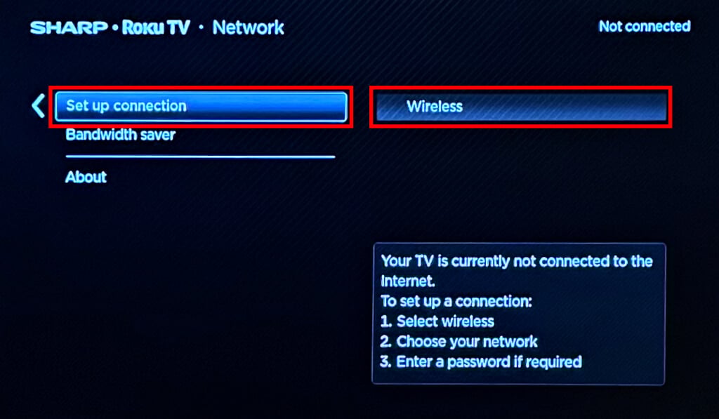 その後、に向かいます設定>ネットワーク>接続を設定します>無線(再)rokuをWi-Fiに接続します。