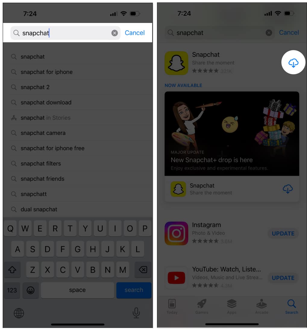 正常にアンインストールした後、検索しますsnapchatアプリストアで。次に、タップしますダウンロードそれを再インストールするアイコン。