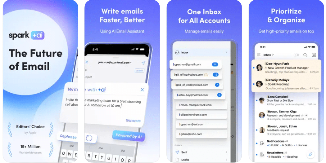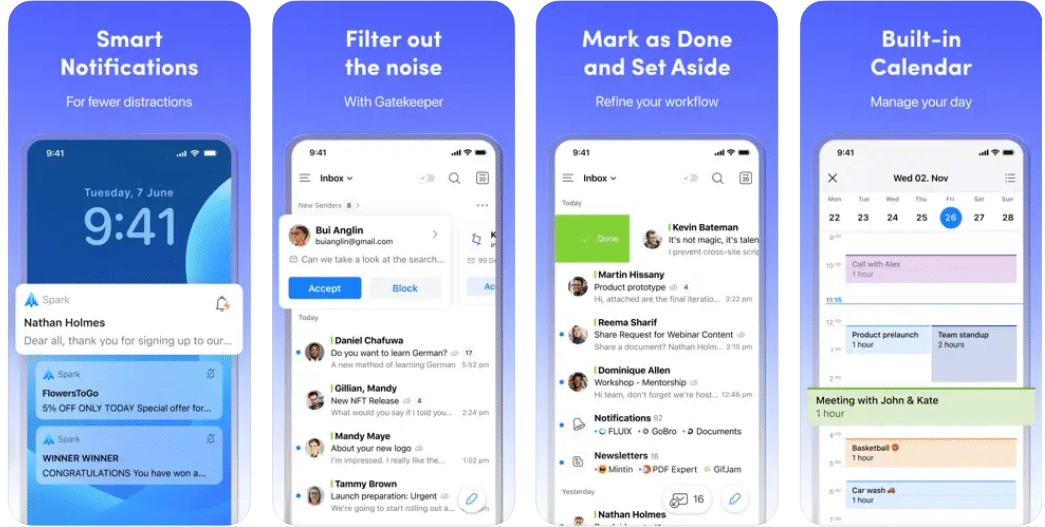 Sparkは、メッセージをスヌーゼンする、リマインダーの設定、電子メールのスケジュールなどの機能を備えた最新のアプローチを取り入れています。アプリやニュースレターからの通知を除外しながら、本物の連絡先からのメッセージをインテリジェントに優先順位付けします。優先電子メール関数は、重要な送信者とピンの重要なメッセージを強調していますが、GateKeeperには不明な電子メールがフラグを付けて、それらを受け入れるか拒否するように促します。これの通知は、設定で調整できます。
