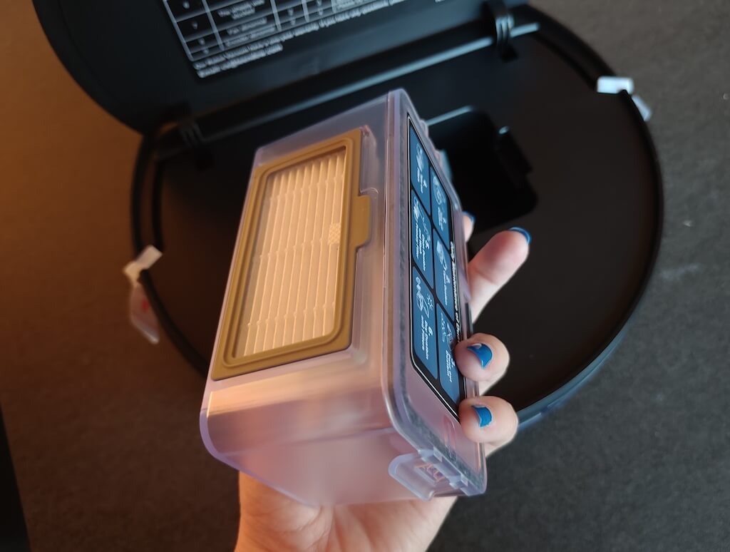 真空の上部パネルには、パワーと充電用の直感的なボタンがあります。上蓋を開けると、小さなダストビンとフィルターが掃除機の中に表示されます。ダストボックスの容量はわずか200 mlですが、少しです。これは、特に大きな混乱を拾うためにG20が必要な場合は、頻繁に空にする必要があることを意味します。