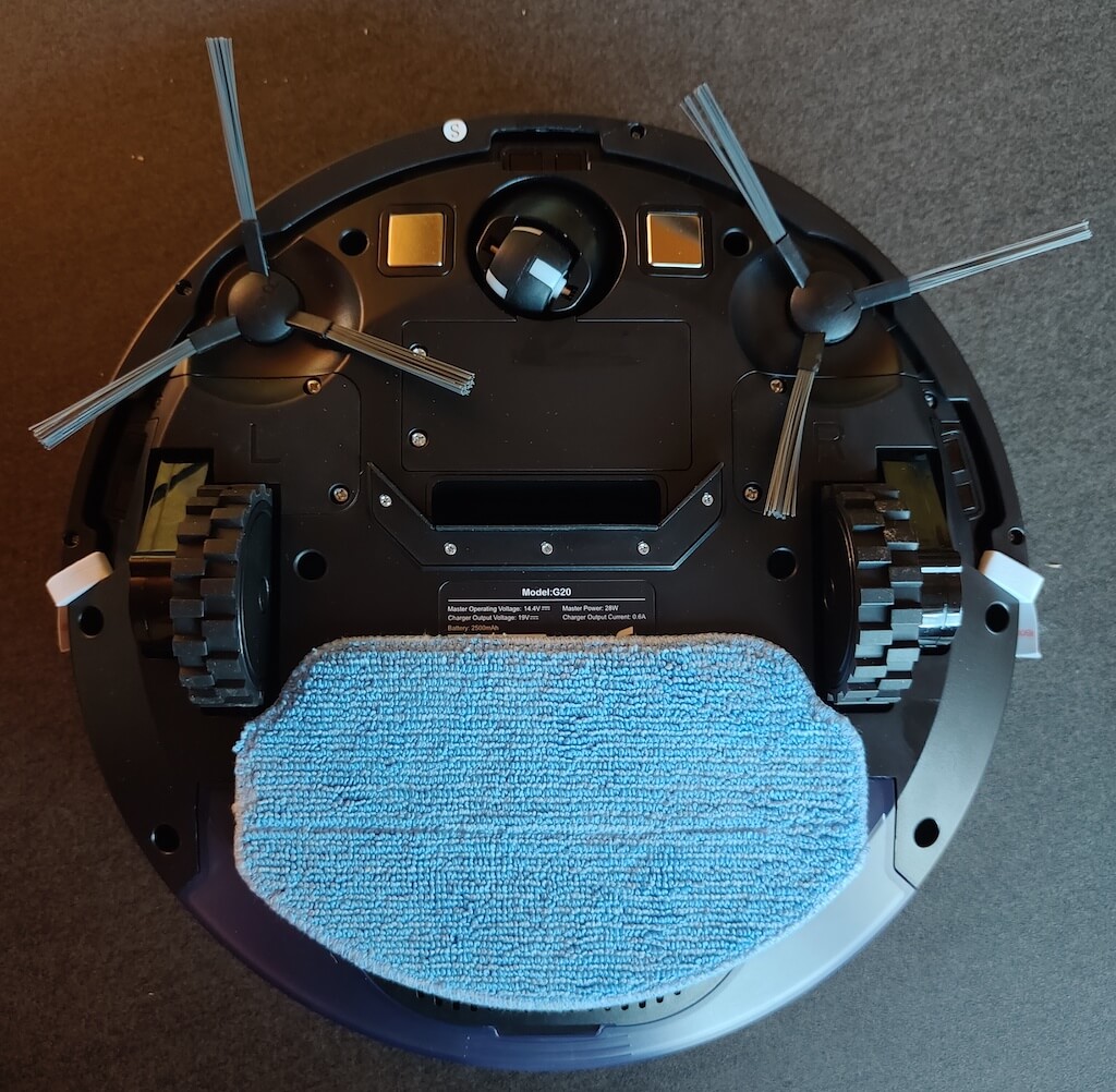 Robovacの底には、両側に2つのドライブホイールがあり、ユニバーサルホイールが前にあります。最初の使用前に、G20ロボットの真空に2つのサイドブラシを取り付ける必要があります。その下には、モップボードから簡単に取り外すことができるMOPパッドがあります。
