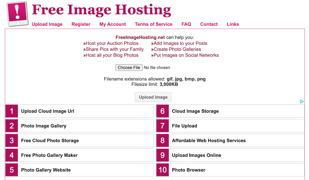 Free Image Hostingは、少し時代遅れに見えるかもしれないファイルホスティングプラットフォームですが、うまく機能します。インターフェイスはあまりモダンではなく、むしろミニマルではありません。ただし、これにより、サービスを簡単に移動できます。