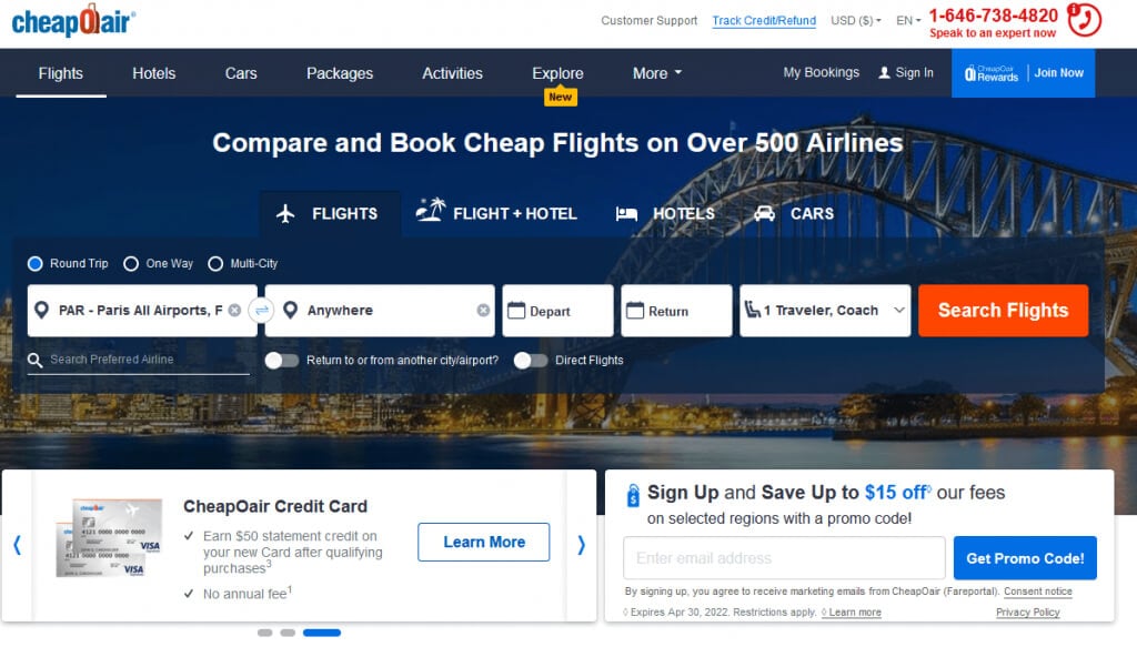 Cheapoairには、ポイントシステムに基づいた報酬プログラムもあります。サインアップのためだけに最初の500ポイントを受け取ります。その後、サイトは、最初の予約、ホテル、またはフライトの後、アカウントにさらに500ポイントを追加します。これらの最初の1000ポイントを収集した後、Cheapoairを通じて費やした各ドルはさらに1ポイントを着陸させます。また、使用するごとに7ドルを追加するCheapoairクレジットカードを選択することもできます。