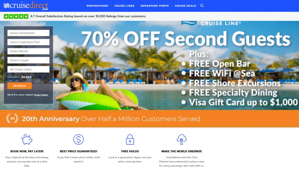 Cruise Directは予約料を請求せず、価格の試合保証を提供します。ただし、ウェブサイトはユーザーに排他的なクルーズを提供していません。