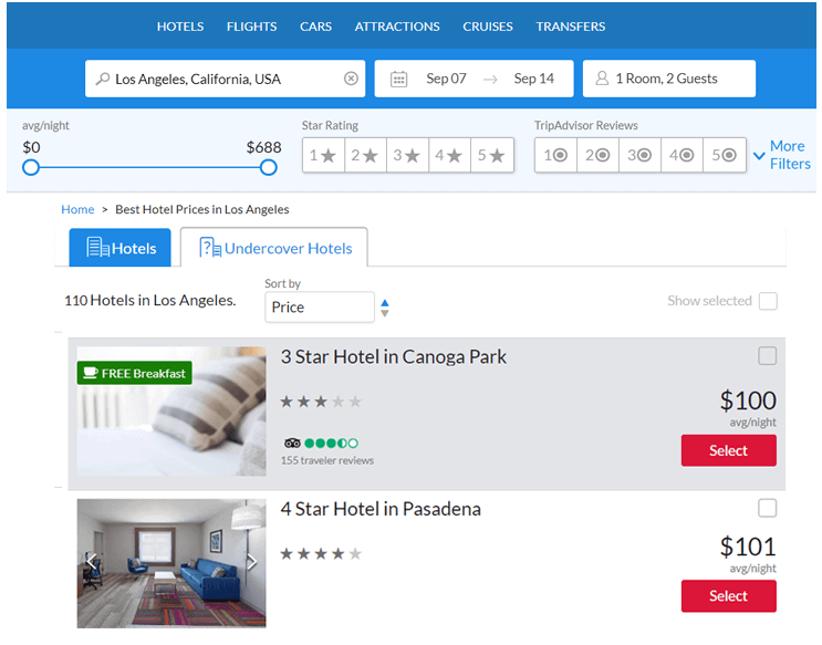 冒険好きなら、あなたは「覆面ホテル」機能を気に入るはずです。スーパーロートラベルオファーは、予約を完了するまでホテルの身元を秘密にします。ただし、予約プロセスを盲目的に行うことはありません。ホテルの一般的な場所、評価、レビュースコアがわかります。 「アンダーカバーホテル」を使用すると、ホテルの部屋で最大65%の割引を受けることができます。