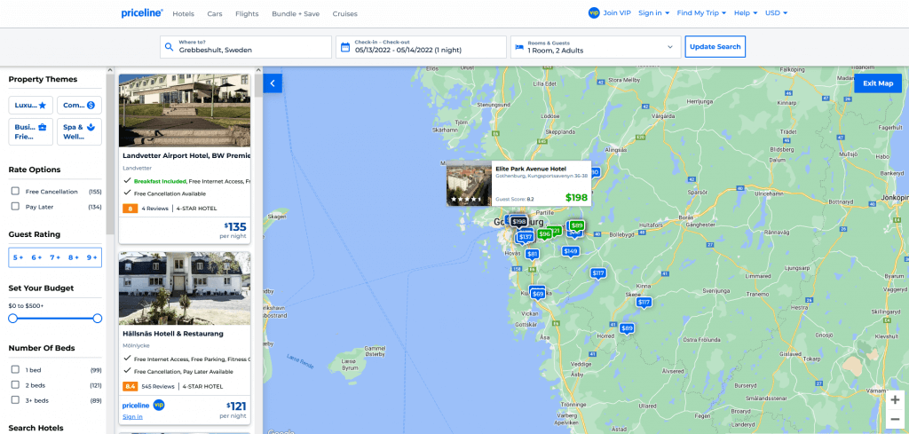 Express取引でリスクを冒したくない人のために、Pricelineは、あなたの土壇場での旅行に利用できるすべての宿泊施設を示す非常に詳細で使いやすいマップを提供します。場所にカーソルをホバリングすると(価格でラベル付けされています)、ポップアップディスプレイは、ホテルの評価、名前、およびゲストレビュースコアを示します。