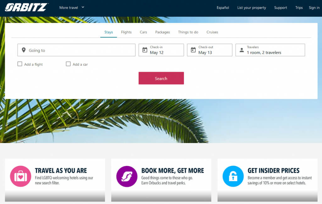 Orbitzを使用して、フライト、ホテル、レンタカーの予約の任意の組み合わせを含む休暇取引を見つけることができます。ウェブサイトでは、旅行期間の一部の宿泊施設を予約することもできます。検索は非常に詳細であり、キャンセルポリシーまたはスパや無料のWi-Fiなどの特定のアメニティでホテルを閲覧できます。