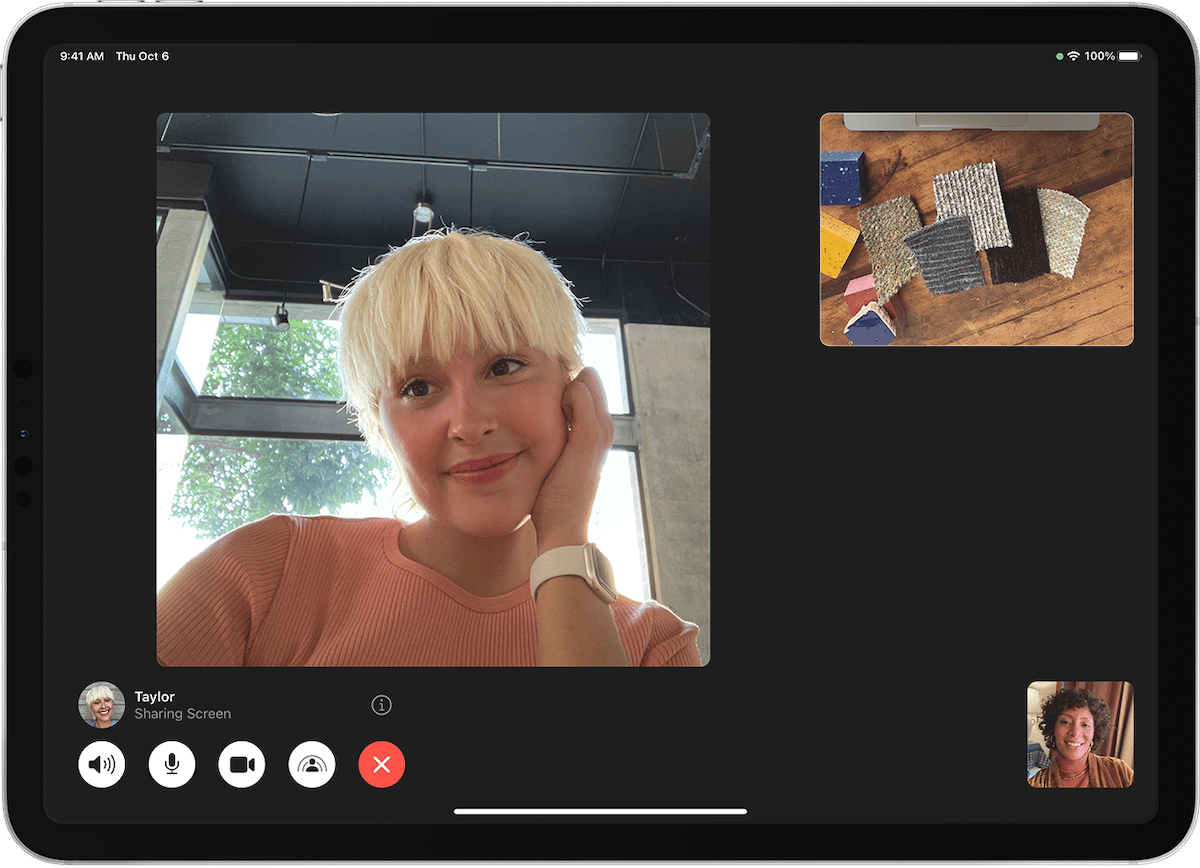 - デスクビューウルトラワイドカメラを使用して、机と顔を見せます。