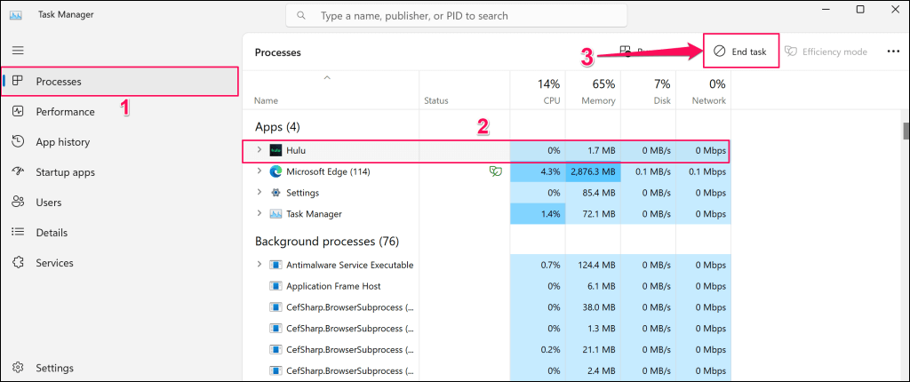 - を選択しますプロセス左側のサイドバーのタブと「アプリ」セクションでHuluを選択します。