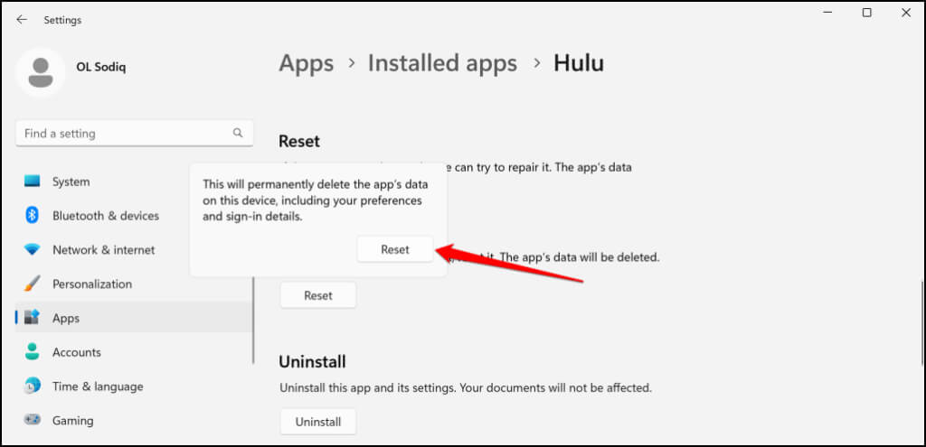 - Huluアプリ情報ページ(ステップ#4を参照)に戻り、リセットボタン。