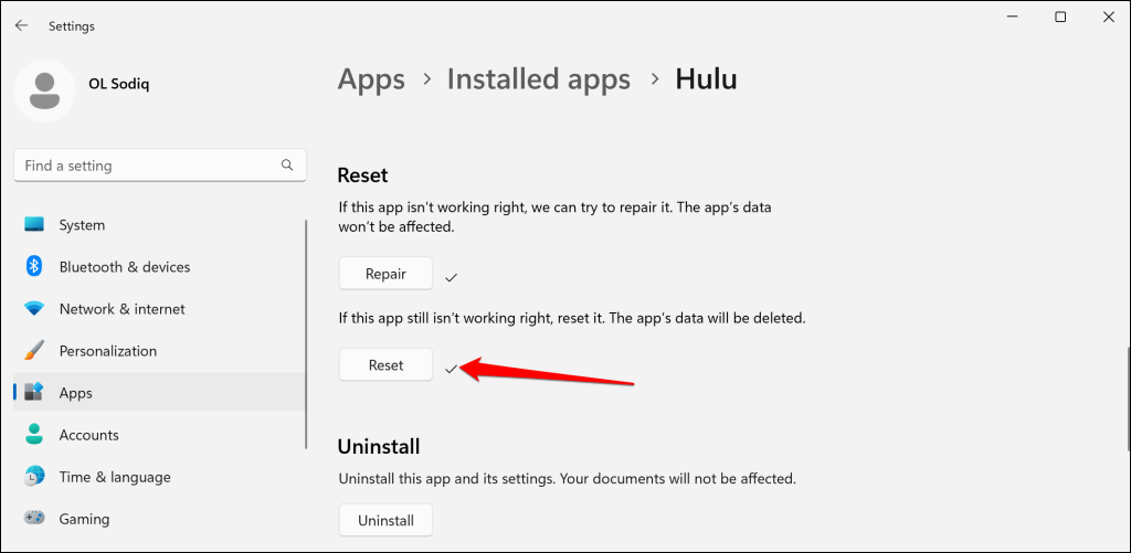 Windows PCには、正しく実行されていないプログラムを修正する修理ツールが組み込まれています。 Force Huluを終了し、Windowsアプリの設定メニューで修理操作を実行します。