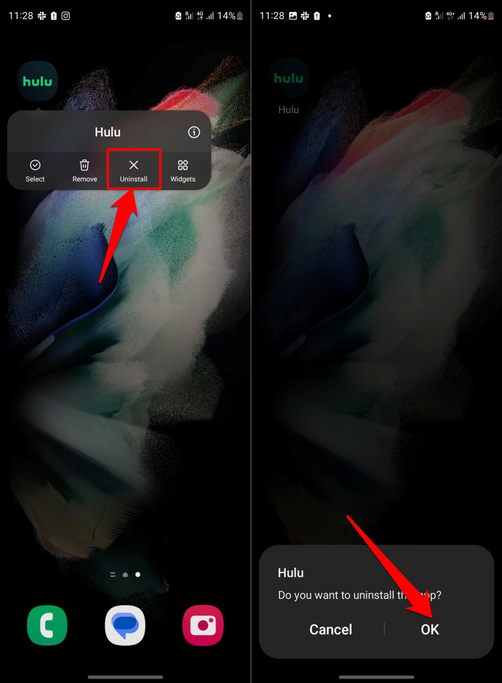 AndroidデバイスのHuluアプリを長時間押します。選択してくださいアンインストールアプリを削除してタップしますわかりました。