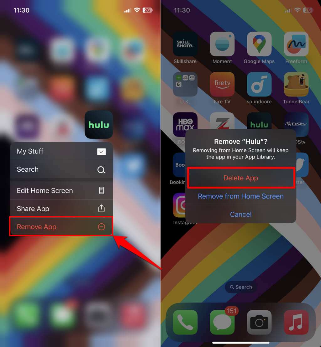 iPhoneまたはiPadにHuluアプリアイコンを押し続け、タップしますアプリを削除します、および選択しますアプリを削除しますポップアップで。