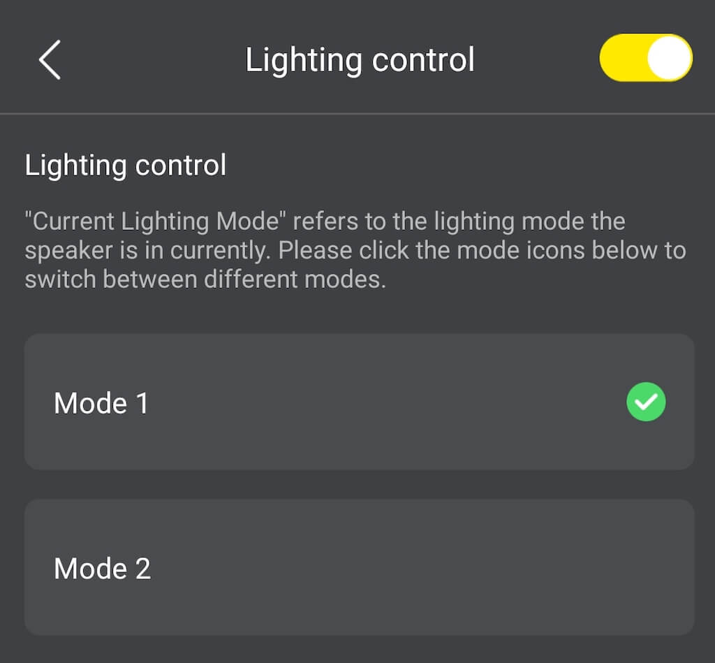 アプリでは、LEDライトショーモードを切り替えることができます。1つのモードはビートドライブで、もう1つのモードはよりランダムです。モード1は、両側パネルとスピーカーLEDのさまざまな色を循環させますが、モード2はスピーカーLEDを同じ色に保ち、サイドパネルに虹の効果を作成します。画面の上部にあるトグルスイッチを使用すると、音声のみのエクスペリエンスを実現するためにスピーカーライトをオフにすることができます。