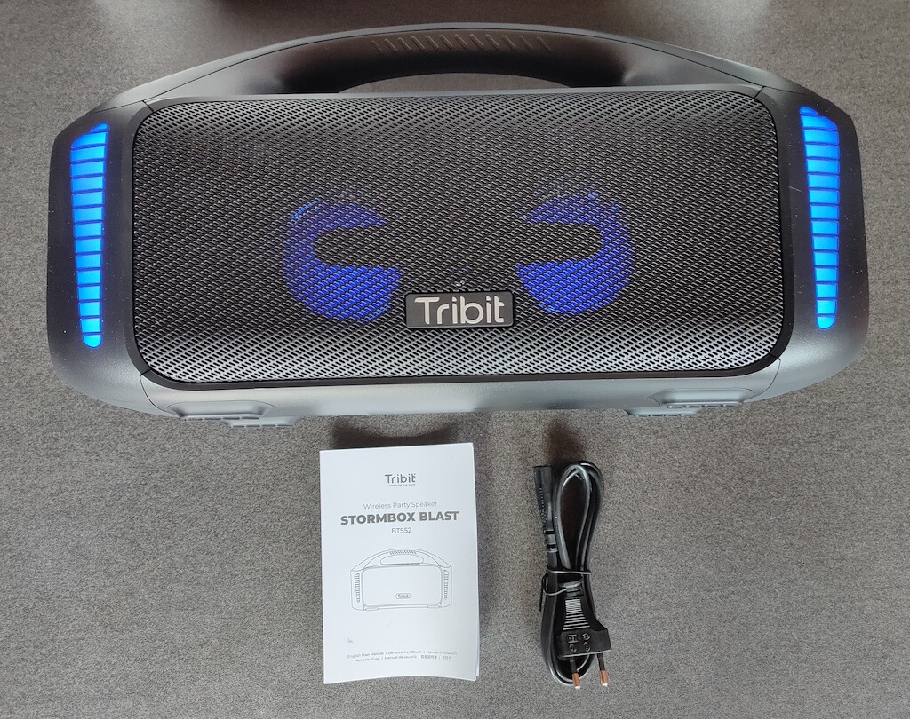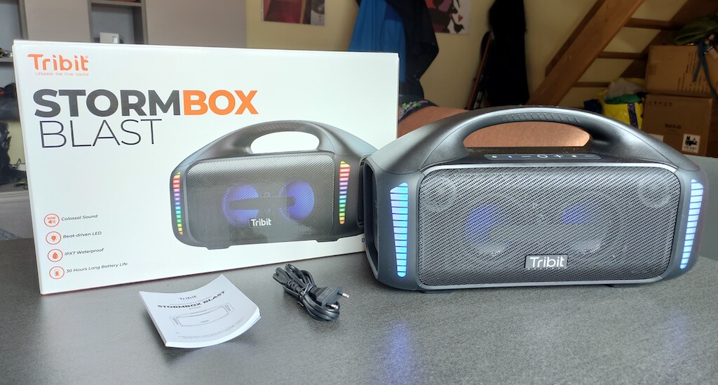 スピーカーの外観を分析し続ける前に、Tribit Stormbox Blastを開梱するときに箱にあるすべてのものがあります。