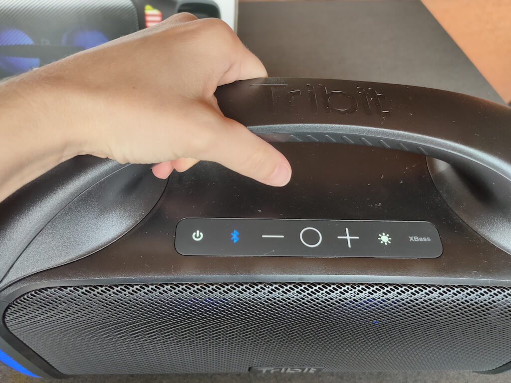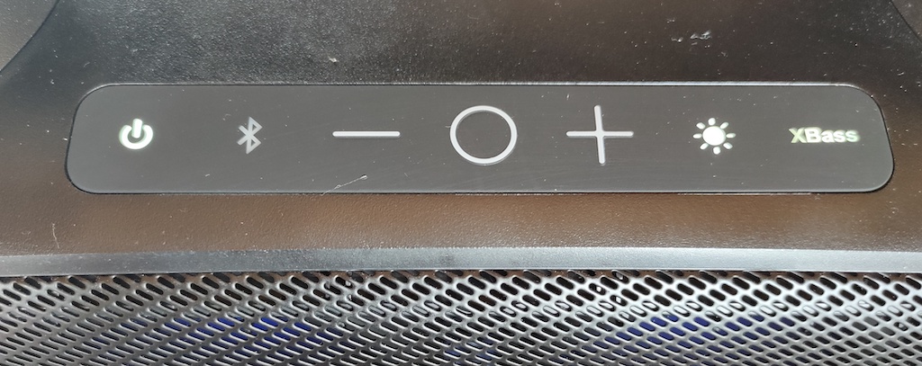 スピーカーの上に、中央のコントロールパネルがあります。中央の再生および追跡ナビゲーションのメインマルチ機能ボタン、電源ボタン、ペアリングボタン、LED、XBassボタンがあります。