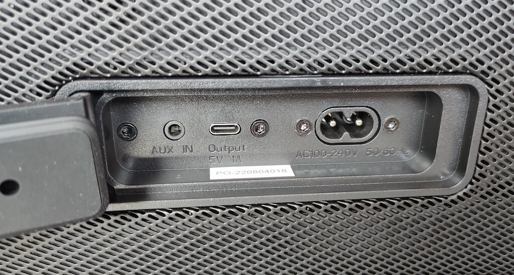 スピーカーの背面には、保護ゴムカバーの後ろに隠された接続パネルがあります。スピーカーを充電するためのメインポート、3.5mmのAUX入力、およびスピーカーのバッテリーを使用して外部デバイスを充電するためのUSB-Cポートが表示されます。