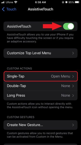 - アシスタントタッチを有効にしたら、1つをタップしますカスタムアクション。私たちは選びましたシングルタップ。