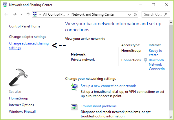 2。ネットワークおよび共有センターウィンドウで、クリックします高度な共有設定を変更します以下に示すようにリンク。