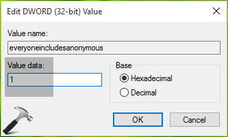 3。の右ペインにLSAキー、名前付きレジストリDWORD(reg_dword)を探します誰もがincludeannynomousです値は0に設定されている可能性があります。それをダブルクリックして値を変更します。