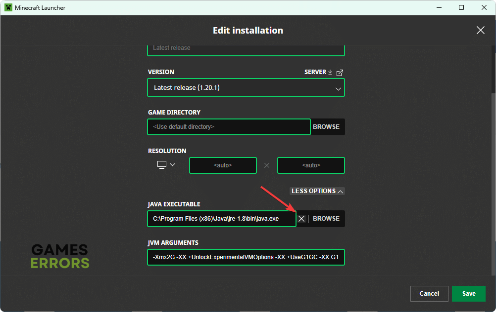 - Java実行可能ファイルを削除して、ゲームにバンドルされたデフォルトの実行可能を使用して、[保存]をクリックします。