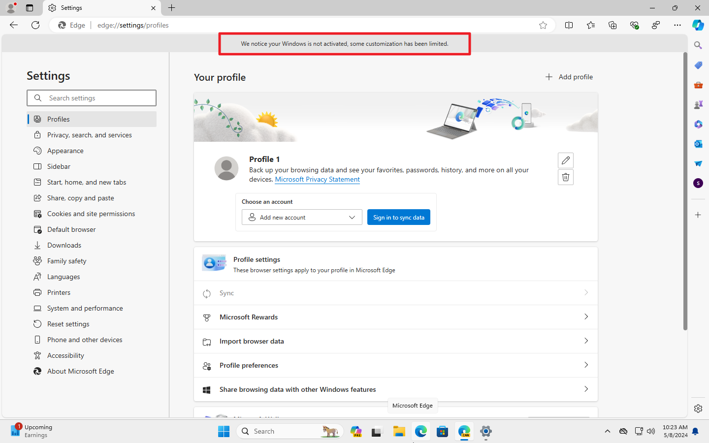 有効になると、Edgeはアクティブ化されていないシステムの設定に次のメッセージを表示します。「ウィンドウがアクティブになっていないことに気付き、いくつかのカスタマイズが制限されています」。