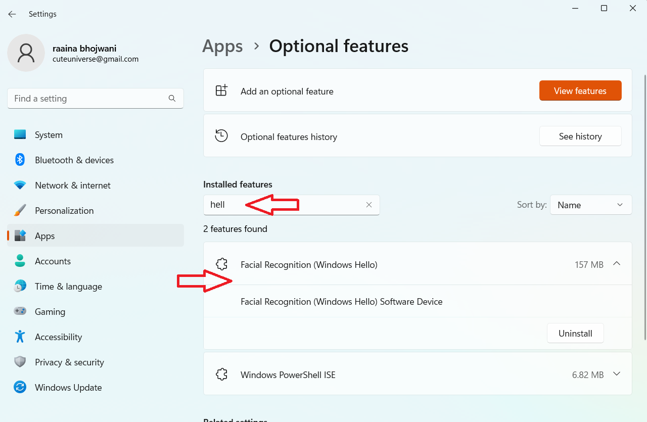 5.次に、検索バーにHelloを入力してチェックします顔認識(Windowsこんにちは)チェックボックス。