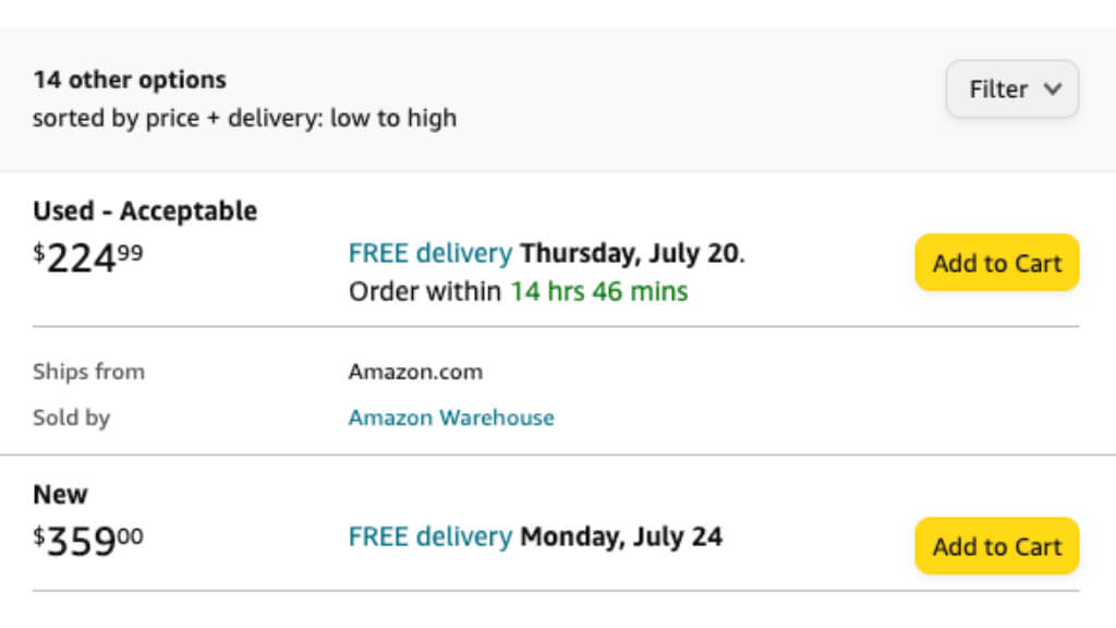 Amazonには、オープンボックスアイテムを購入する際に十分な情報に基づいた決定を下すのに役立つ合理的に包括的なグレーディングシステムがあります。 「使用 - 新品のように」と「非常に良い」に加えて、「使用済み - 良い」や「使用容認可能」などの他の用語に出くわすこともあります。
