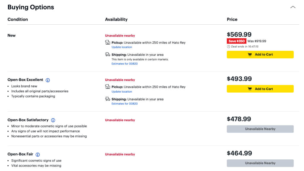 UPC(Universal製品コード)を常にチェックして、異なるプラットフォームで同じモデルを比較していることを確認してください。オープンボックスの取引は古いモデルである場合がありますが、必ずしも悪いことではありませんが、改善やバグの修正はもう少し支払う価値があるかもしれません。
