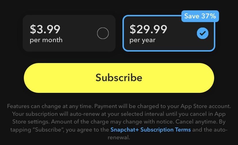 もちろん、Snapchat Plusを購読する決定に至る最も重要な要因の1つは、おそらく価格帯です。 Snapchat Plusが提供するすべての機能にアクセスするには、支払いのためのいくつかのオプションがあります。まず、月額3.99ドルで毎月支払うことができます。 1年間1つの一時金で支払う場合は、29.99ドルでこれを行い、お金を節約できます。