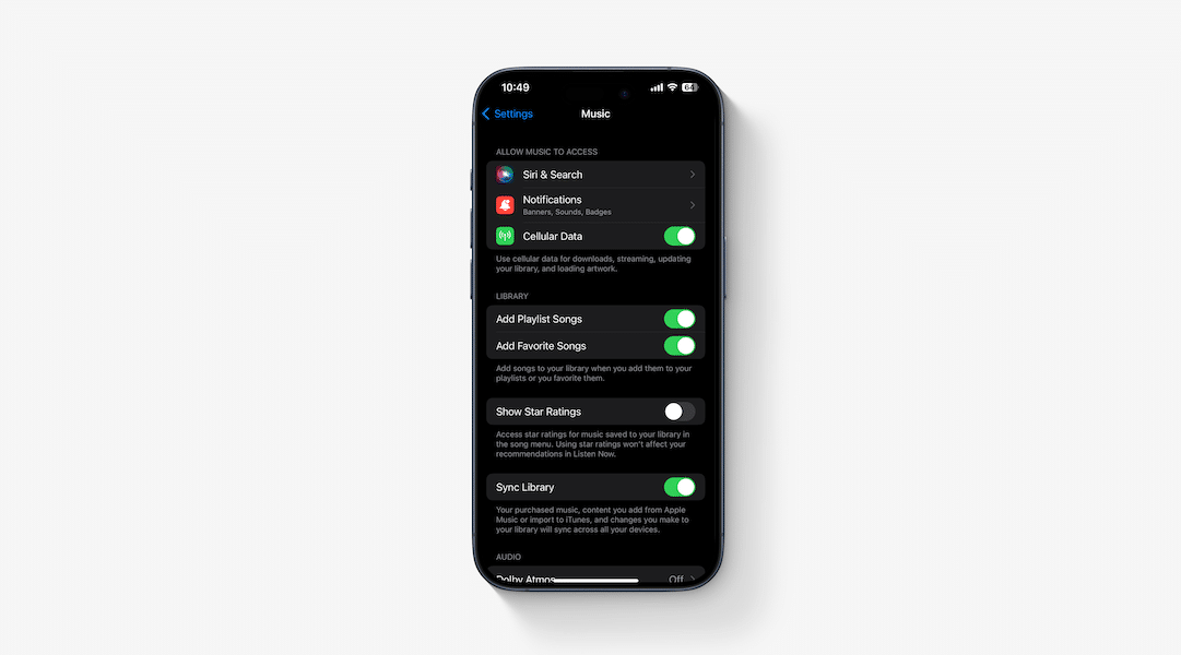 - お気に入りの曲のトグルを追加します設定アプリのApple Music Settingsにも追加されています。オンになると、お気に入りの曲がライブラリに自動的に追加されます。