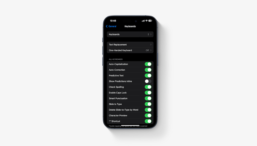 - キーボード設定は、新しい「予測的オンラインを表示する」トグルを追加しました予測テキストをオン/オフにします。設定アプリ>一般>キーボード>オンライン予測値を表示します。
