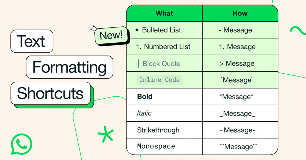 主要なメッセージングプラットフォームであるWhatsAppは、ユーザーのコミュニケーション方法を魅了し、4つの新しいテキストフォーマットオプションを導入しました。メッセージの組織と明確さを強化するために、WhatsAppは箇条書きのリスト、ブロック見積、インラインコード機能を提供するようになりました。これらの機能は、特にグループチャットでより効果的なコミュニケーションを促進するように設計されており、Android、iOS、Web、およびMacプラットフォームで利用できます。