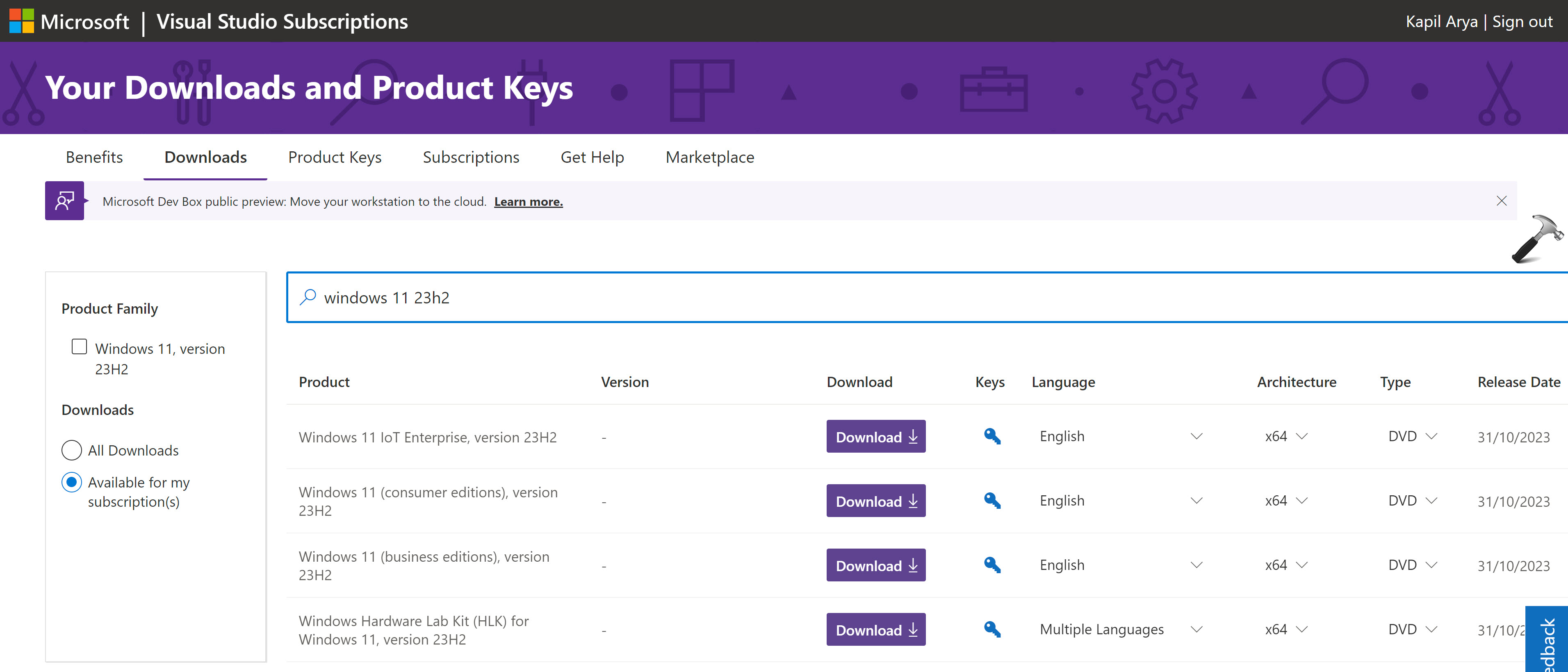 Windows 11バージョン23H2 ISOファイルは、Visual Studio Subscribersでもご利用いただけます。