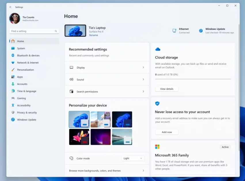 今後のWindows 11 23H2アップデートには、設定アプリに新しい「ホーム」ページが付属しています。新しいページは、お気に入りの設定と機能にすばやくアクセスできるカードとよりパーソナライズされ、インタラクティブになります。