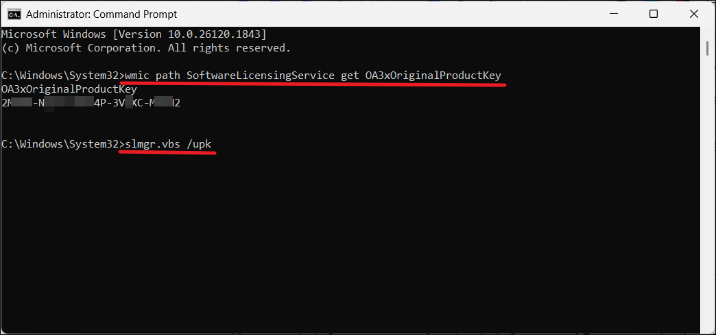 別のWindows 11コンピューターがある場合は、コマンドプロンプトの以下のコマンドを使用して、プロダクトキーを確認します。
